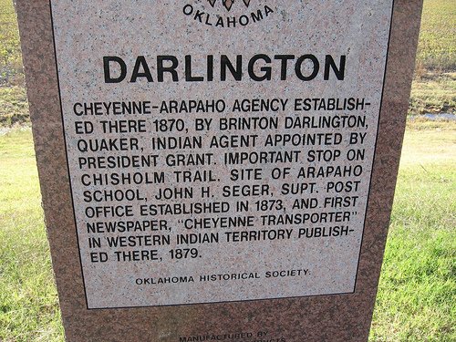 Darlington - Cheyenne-Arapaho Agency Established there 1870, by Brinton Darlington, Quaker, Indian Agent appointed by President Grant. Important Stop on Chisholm Trail Site of Arapaho School, John H. Seger, Supt. Post Office Established in 1873, and First Newspaper "Cheyenne Transporter" in Western Indian Territory published there, 1879. Oklahoma Historical Society