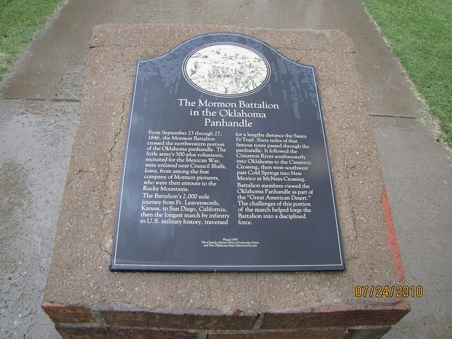 From September 23 through 27, 1846, the Mormon Battalion crossed the northwestern portion of the Oklahoma Panhandle. The little army's 500-plus volunteers, recruited for the Mexican War, were enlisted near Council Bluffs, Iowa, from among the first company of Mormon pioneers, who were then en-route to the Rocky Mountains.