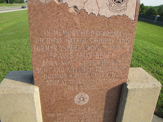In memory of Oklahoma Highway Patrol Trooper and former Sapulpa police officer Travis Leon Bench. Born Nov. 24, 1955, who was shot and killed in the line of duty on a routien traffic stop at this location on Oct. 5, 1983.