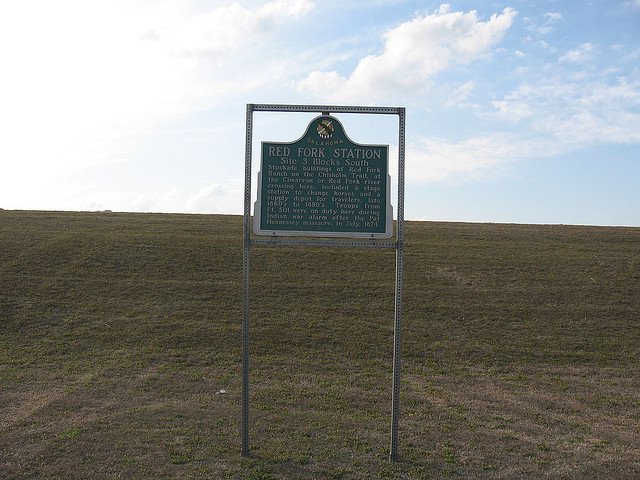 Stockade buildings of Red Fork Ranch on the Chisholm Trail , at the Cimarron or Red Fork river crossing here, included a stage station to change horse and a supply depot for travelers, late 1860's to 1890's. Troops from Ft. Sill were on duty here during Indian war alarm after the Pat Hennessey massacre, in July 1874.
