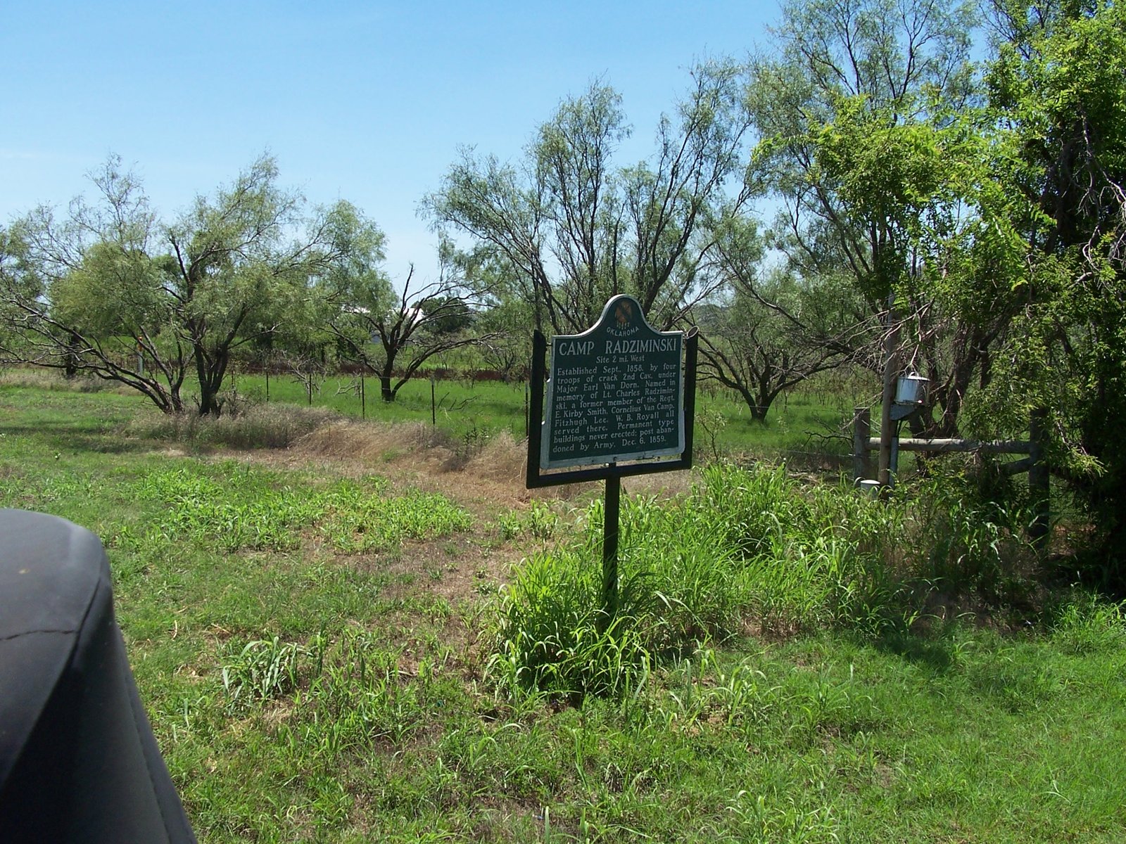 Established Sept. 1858, by four troops of crack 2nd Cav. under Major Earl Van Dorn. Named in memory of Lt. Charles Radzimisnski, a former member of the Regt. E. Kirby Smith. Cornelius Van Camp, Fitzhugh Lee, W. B. Royall all served there. Permanent type buildings never erected; post abandoned by Army, Dec 6, 1859