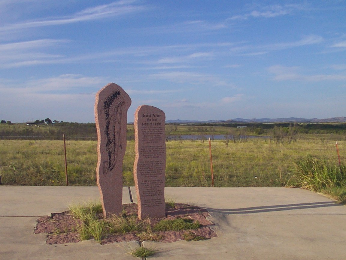 Quanah Parker the last of the Comanche chief was born in Elk Creek just below the Washita mountains circa 1850. Quanah, the son of Pitih Norony and Cynitha Ann Parker who was captured by the Comanches, became a fierce warrior and skillfully defended Comancheria against all invades. Col. Ronald McKenzie pursued Quanah for years but never captured or defeated him. The destruction of the buffalo forced Quanah to lead the Comanche down this trail to Fort Sill in June 1878. A born leader Quanah bridged the great gap between the old world as a War Chief to the new life as a Civil Chief without losing his Comanche identity. A prominent and influential figure he made numerous politic and economic issues. (Quanah) In 1889 he built Star House a ten room two story house ten mile NE of this sight for his wifes, children and anyone who was seeking help. Quanah was buried in 1911 at Post Oak Mission seven miles NE and reburied 1957 in Fort Sill. The spirit of Quanah Parker the Eagle of the Comanches welcomes you to his scared home the Washita Mountains.