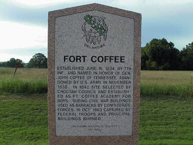 Established June 16, 1834, by 7th Inf., and named in honor of Gen. John Coffee of Tennessee. Abandoned by U.S. Army in November 1838. In 1842 site selected by Choctaw Council and established as Ft. Coffee Academy for boys During Civil War buildings used as barracks by Confederate forces. In Oct. 1863 captured by Federal troops and principal buildings burned.