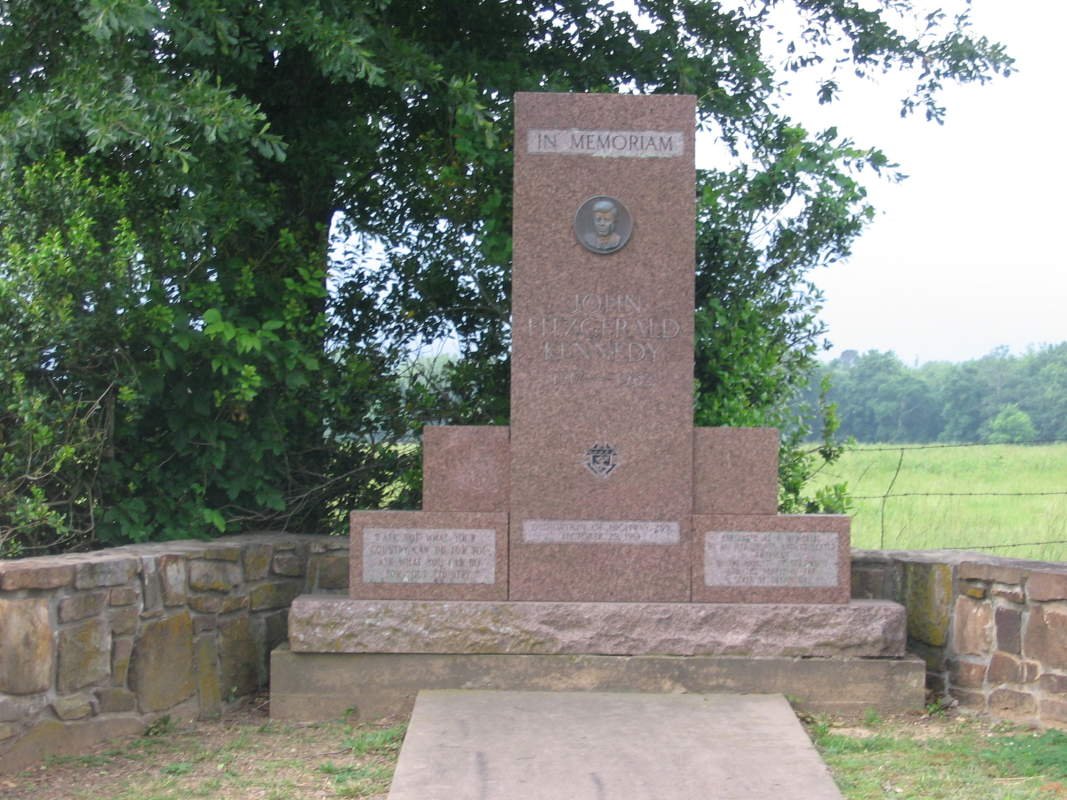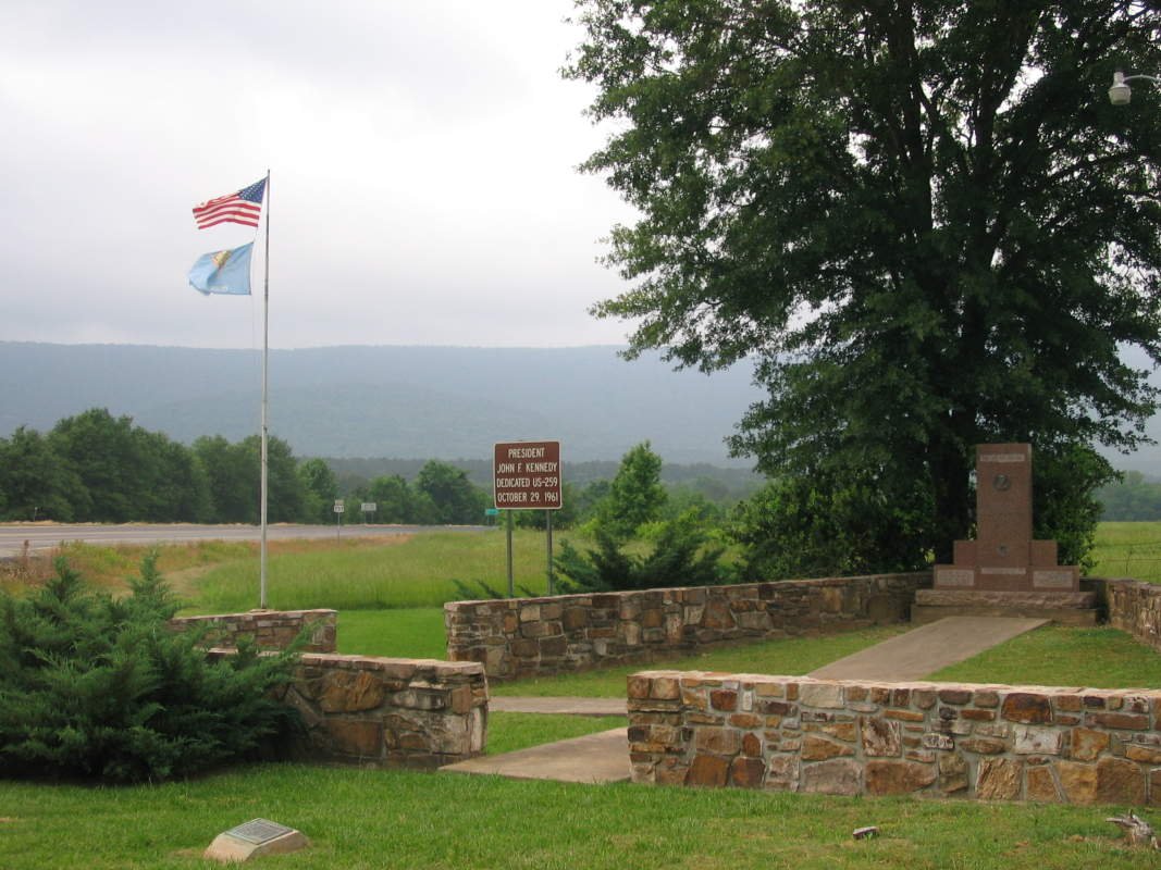 This monument, commemorating the visit of President John F. Kennedy to Big Cedar, was erected under the auspices of the Knights of Columbus, who deeded shaft and land to the Oklahoma Historical Society on October 30, 1966.