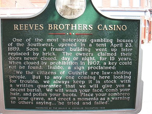 One of the most notorious gambling houses of the Southwest, opened in a tent April 23, 1889. Soon a frame building went up later replaced by brick. The owners claimed their doors never closed, day or night for 15 years. When closed by prohibition in 1907, a key could not be found. Inside a sign proclaimed: "We the citizens of Guthrie are law-abiding people. But to anyone coming here looking for trouble, we always keep it in stock with a written guarantee that we will give you a decent burial. We will wash your face, comb your hair, and polish your boots. Place your sombrero on your grave, and erect a momento as a warning to others saying... "he tried and failed."