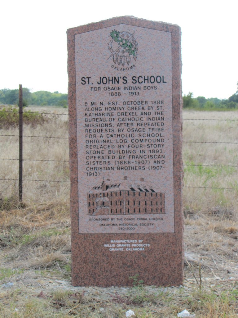 St. John's school for Osage indian boys 1888-1913 8 mi n. Est. October 1888 along Hominy Creek by St. Katharine Drexel and the bureau of catholic indian missions, after repeated requests by Osage tribe for a catholic school. Original log compound replaced by four-story stone building in 1893. Operated by franciscan sisters (1888-1907) and christian brothers (1907-1913). Sponsored by the Osage Tribal Council, Oklahoma Historical Society 240-2000