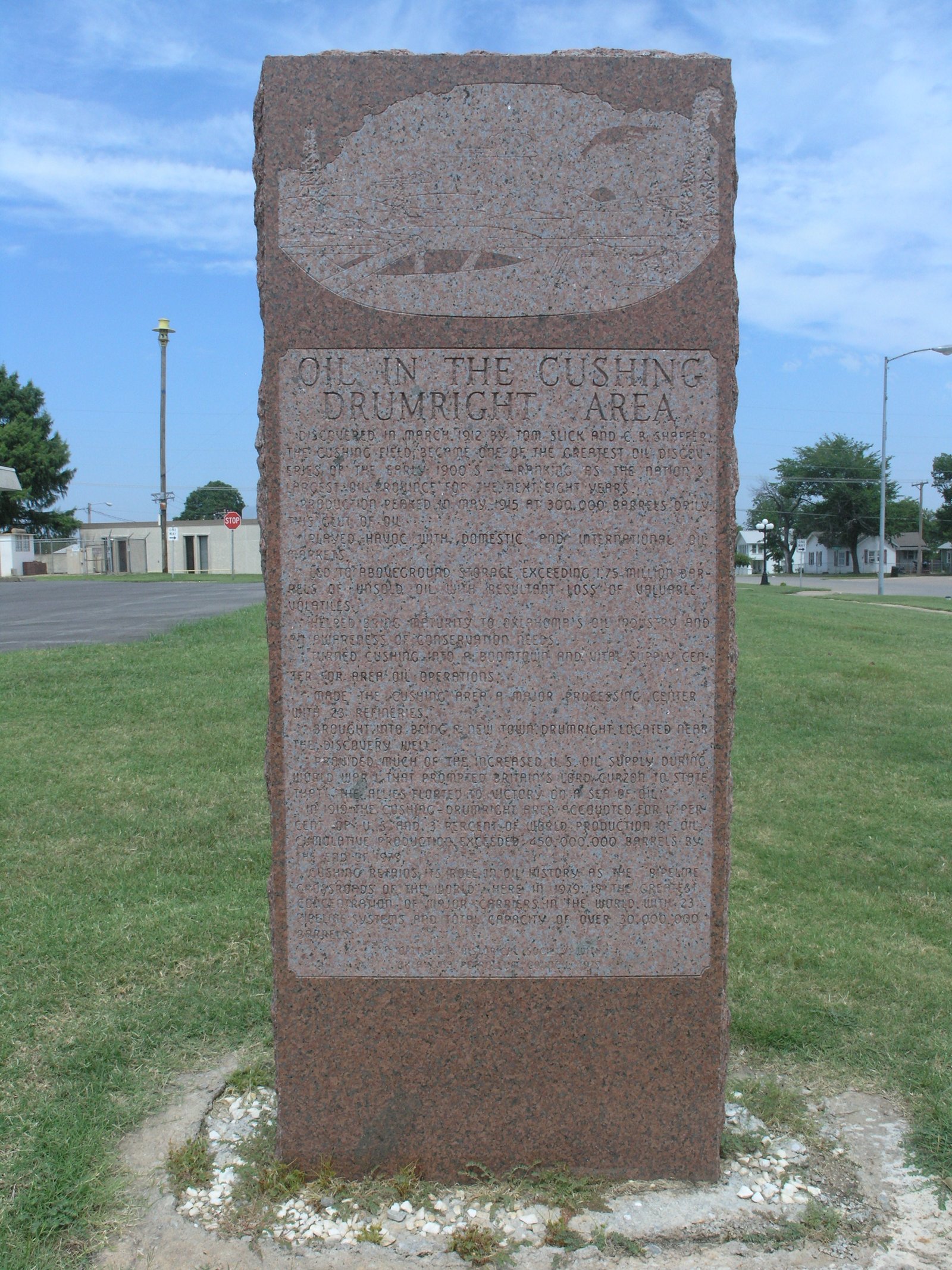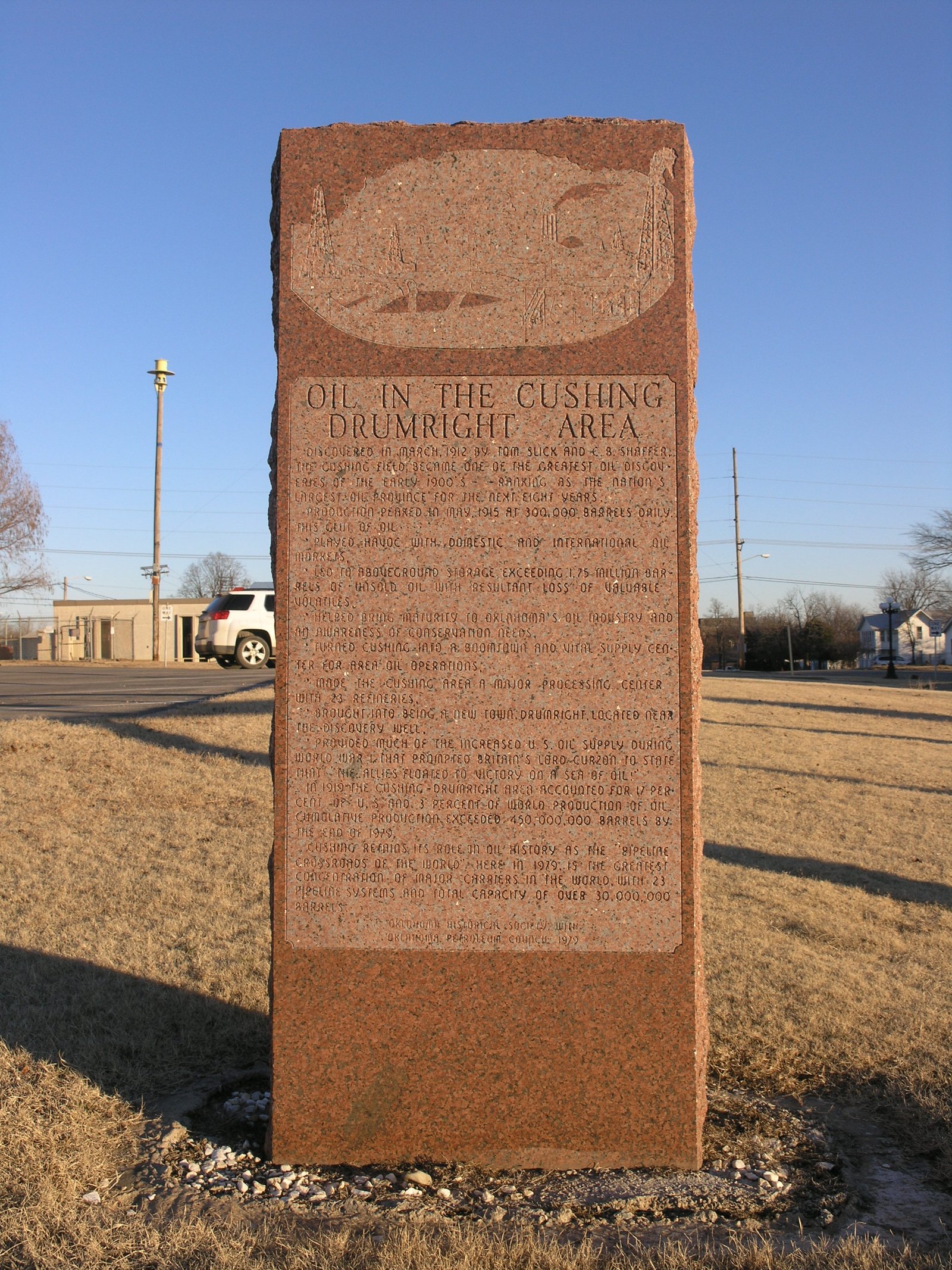Discovered in March 1912 by Tom Slick and C. B. Shaffer, the Cushing field became one of the greatest oil discoveries of the early 1900's -- Ranking as the nation's largest oil province for the next eight years. Production peaked in May 1915 at 300,000 barrels daily. This glut of oil played havoc with domestic and international oil workers. Led to above ground storage exceeding 1.75 million barrels of unsold oil with resultant loss of valuable volatiles. Helped bring maturity to Oklahoma's oil industry and an awareness of conservation needs. Turned Cushing into a boomtown and vital supply center for area oil operations. Made the Cushing area a major processing center with 23 refineries. Brought into being a new town, Drumright, located near the discovery well. Provided much of the increased U.S. oil supply during World War 1 that prompted Britain's Lord Curzon to state that the allies floated to victory on a sea of oil. Cumulative production exceeded 450,000,000 barrels by the end of 1979. Cushing retains its role in oil history as the "pipeline crossroads of the world" Here in 1979 is the greatest concentration of major carriers in the world, with 23 pipeline systems and total capacity of over 30,000,000 barrels. - Oklahoma Historical Society with Oklahoma Petroleum Council, 1979
