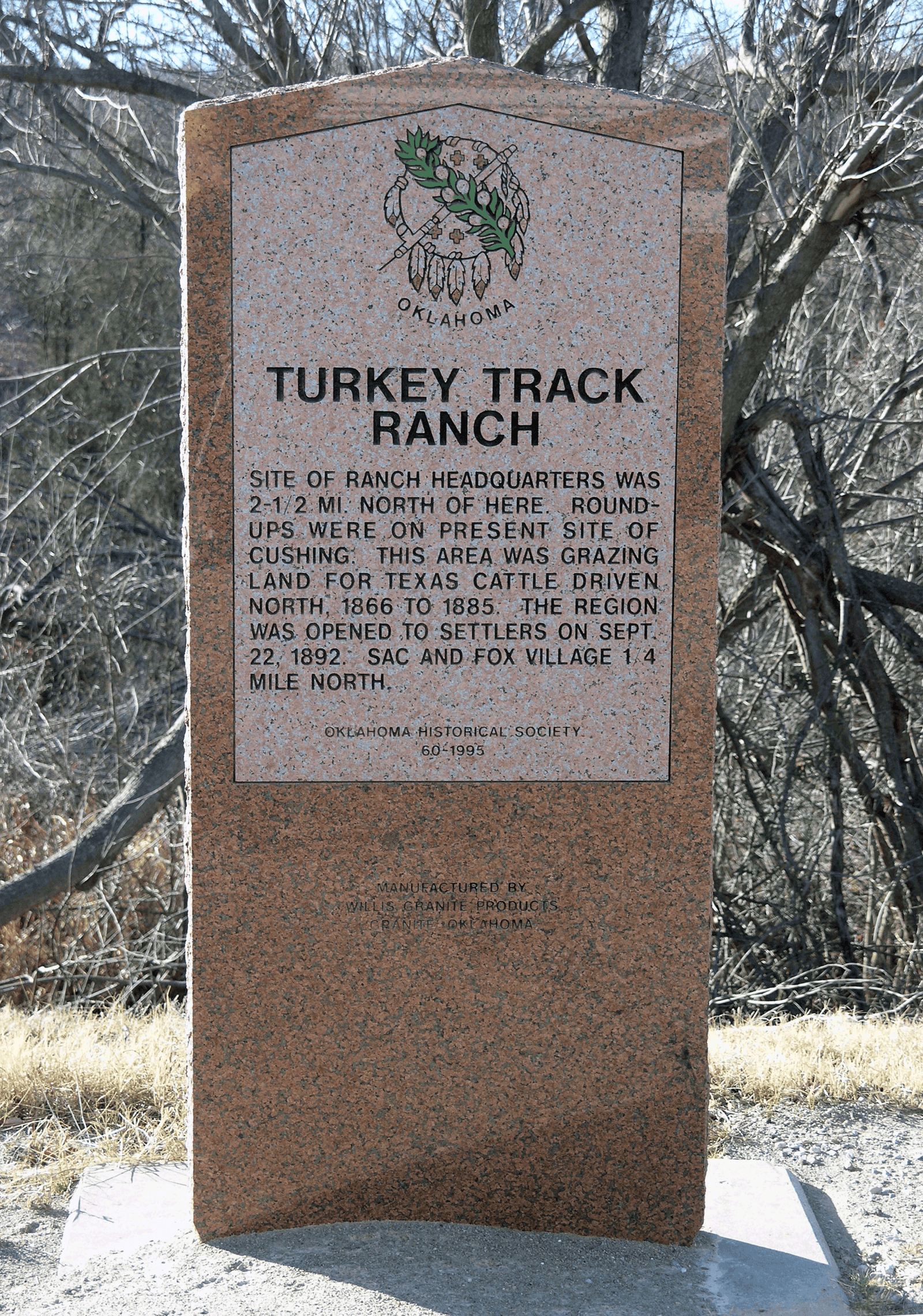 Site of ranch headquarters was 2-1/2 mi north of here. Roundups where on present site of Cushing. This area was grazing land for Texas cattle driven north 1866 to 1885. The region was opened to settlers on Sept. 22, 1892. Sac and Fox village 1/4 mile north.