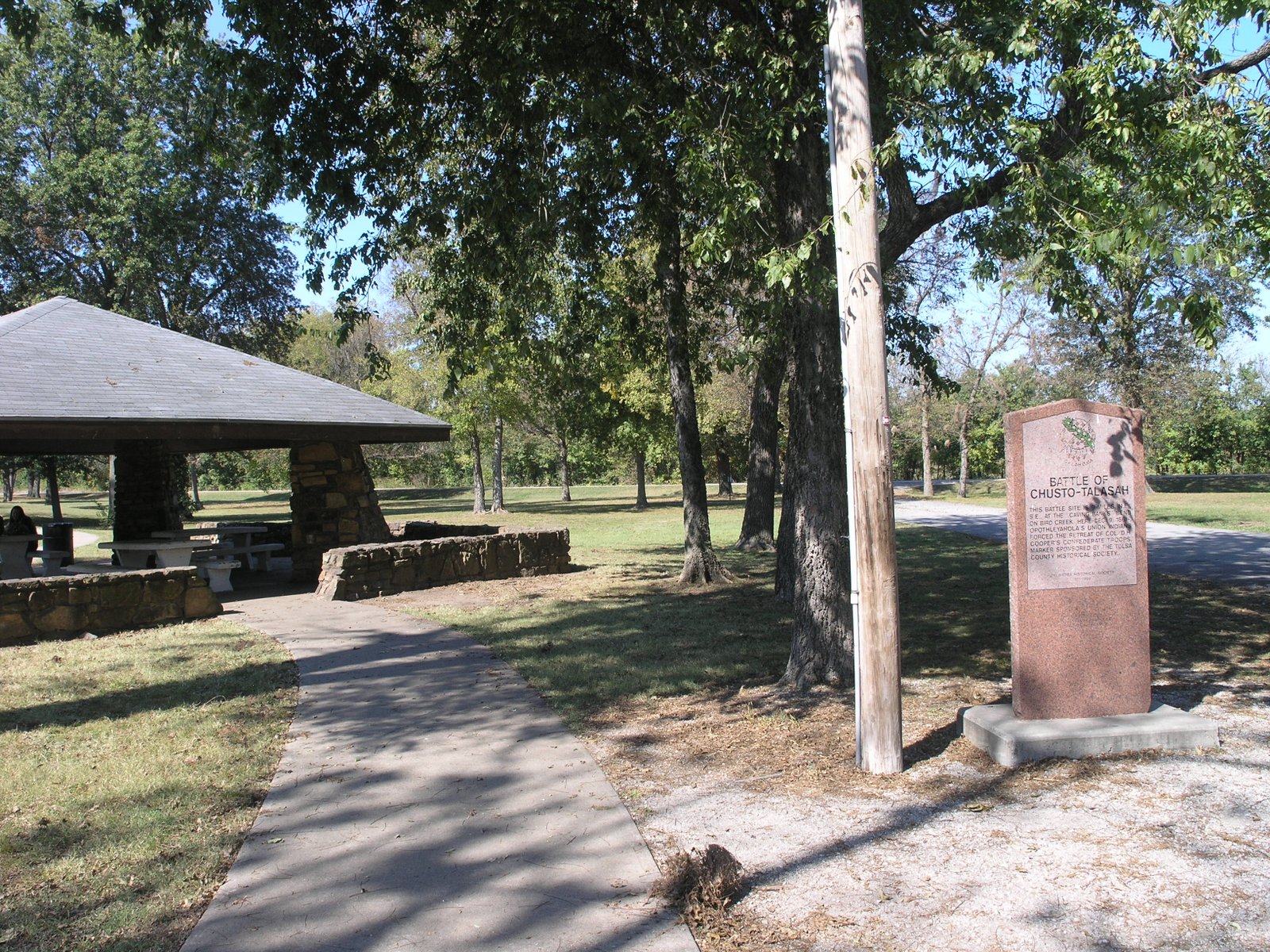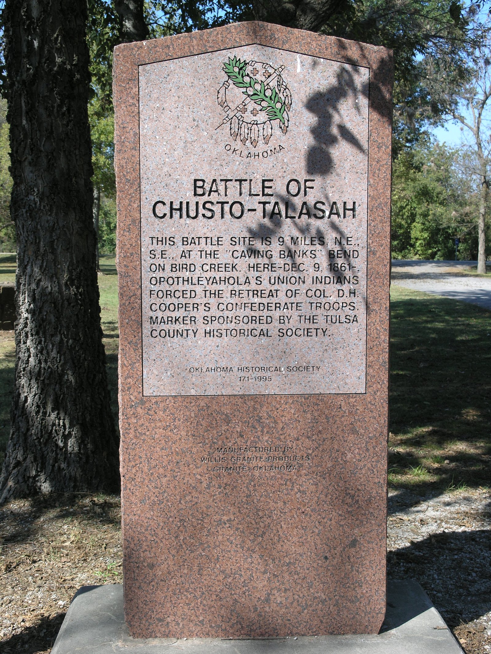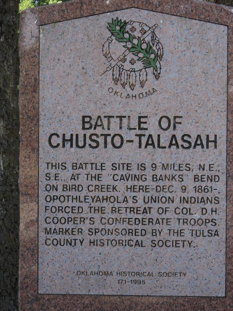 This battle site is 9 miles N.E. S.E at the "Caving Banks" beind on Bird Creek. Here Dec. 9 1861- Opothleyohola's Union indians forced the retreat of Col. D.H. Cooper's Confederate troops. Marker sponsored by the TUlsa County Historical Society.
