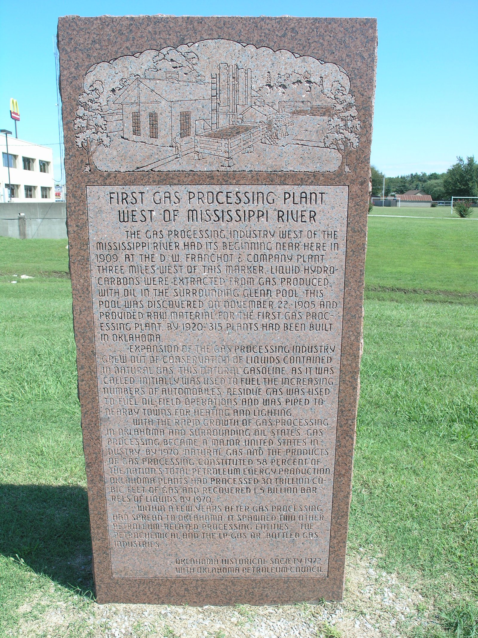 The beginning of Oklahoma's famous oil boom brought the need for processing facilities located near the source of the raw material. Kiefer, Oklahoma, the closest unloading point on the Frisco Railroad to the newly opened oil fields, was the site selected for the first casing-head gas-treating plant which extracted gasoline from wet gas, west of the Mississippi River. The location of the plant in this region was a tremendous boost to the infant, but thriving , oil industry in Oklahoma.