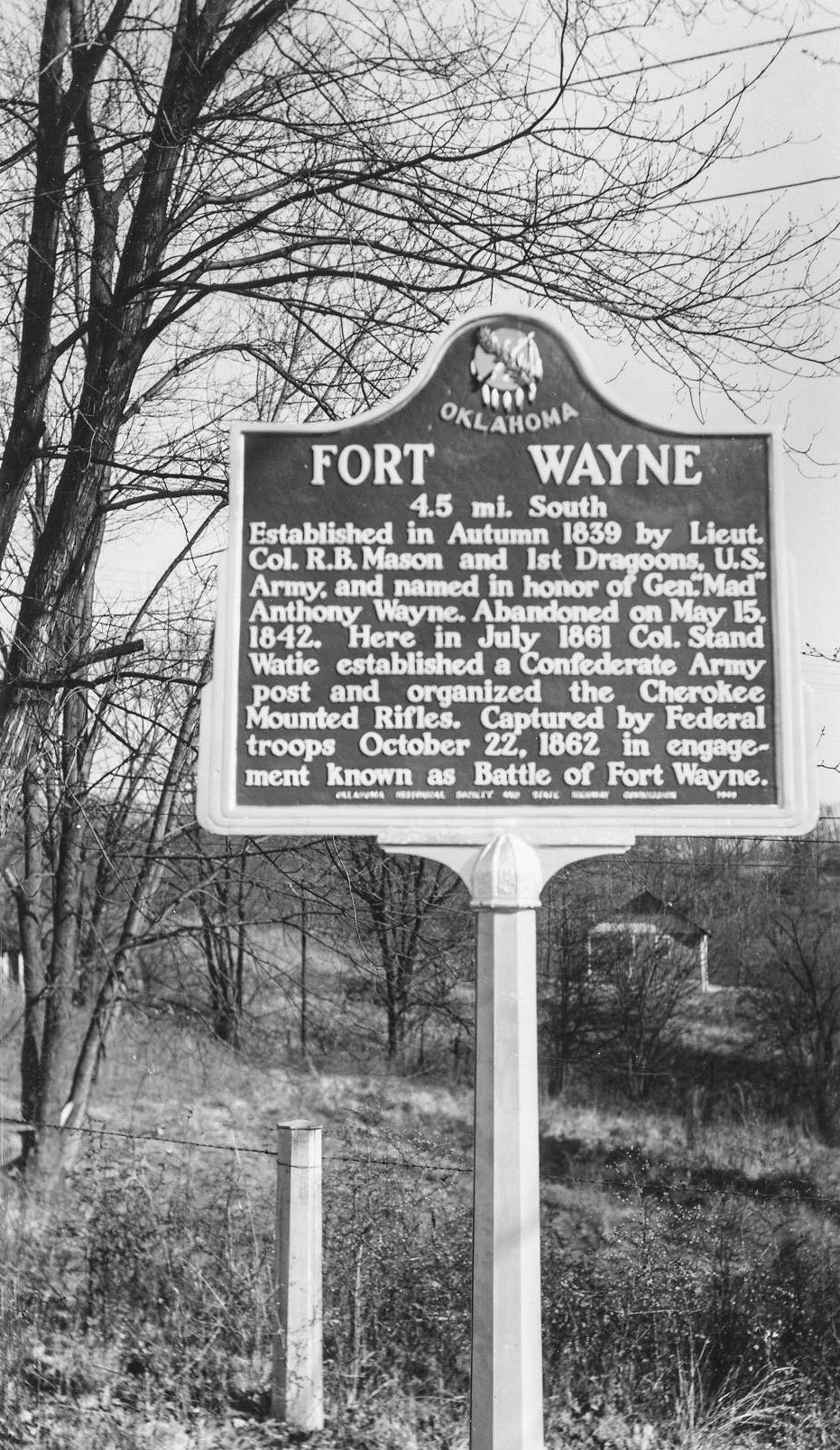 Established in 1838 by Lt. Col. R.B. Mason, 1st Dragoons, U.S. Army, at request of Arkansas citizens fearing Cherokees who were being removed from southeastern U.S. Named in honor of Gen. "Mad" Anthony Wayne, the fort was originally located in NE corner of present-day Watts on a hill, overlooking Illinois River. Considered poor location because many soldiers died there including Capt. John Stuart, 7th infantry. In 1839, fort was abandoned and moved to Beatie's Prairie west of Maysville, Arkansas. That site abandoned in 1842 and troops moved north to establish Fort Scott, Kansas.