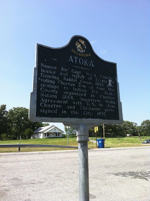 providing Choctaw removal from Mississippi to Indian Ter. Atoka County organized in Choctaw Nation 1854. Important Atoka Agreement with U.S. to close Choctaw and Chickasaw govts., signed in this City, 1897.