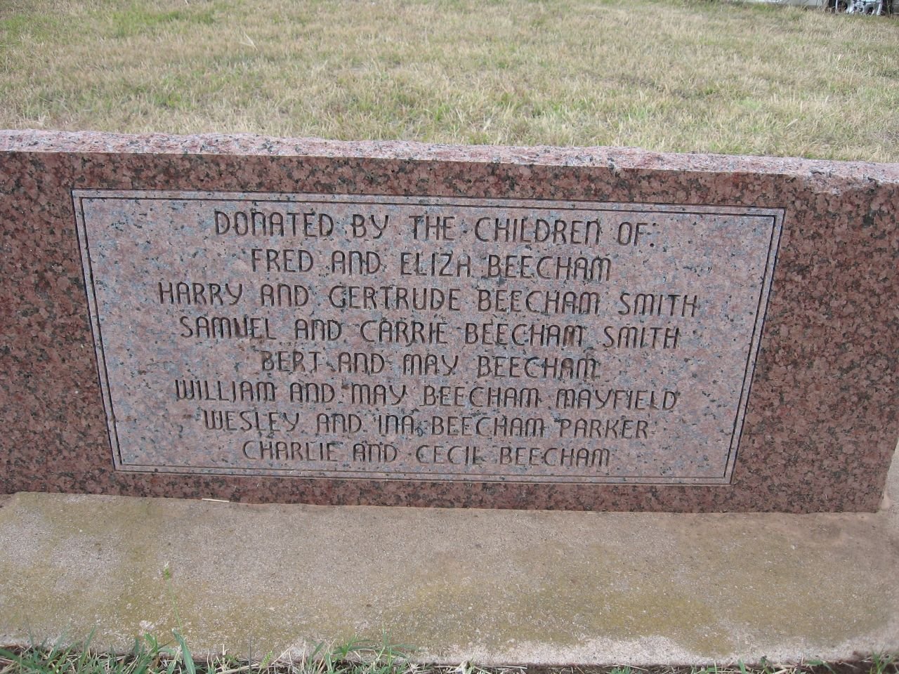 Nathan and Almira Beecham 'Pioneers' to Oklahoma, gave this plot of ground in 1891 to become the Beecham Cemetery. Their two children, Guy Will and Neti Pearl Beecham, were the first to be interred here. Descendants and friend of the pioneer have since extablished perpetual care for this cemetery.