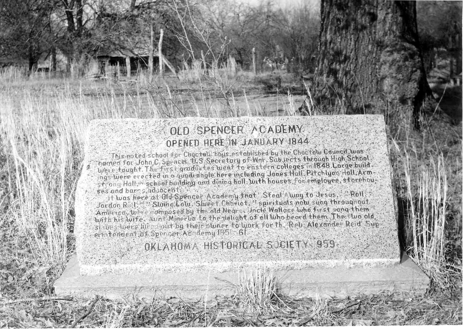 A noted school for boys, Spencer Academy was established by the Choctaw Nation in 1841 and named for Secretary of War John C. Spencer. Students who became Choctaw leaders included Allen Wright, Jackson McCurtain, and Jefferson Gardner. Two elderly black slaves, Uncle Wallace and his wife, Aunt Minerva, hired out by their Choctaw owner to work for missionaries at the academy, first sang "Swing Low Sweet Chariot," "Roll, Jordan, Roll" and other spirituals composed nearby.