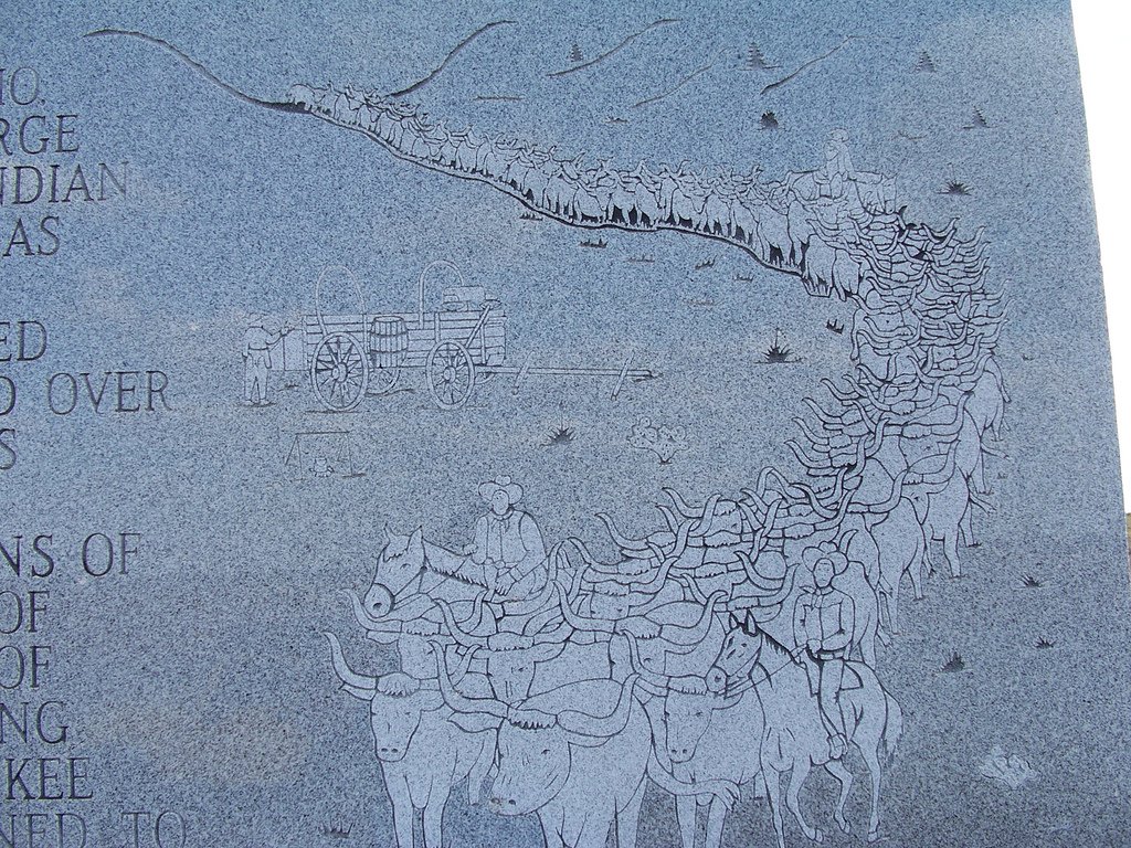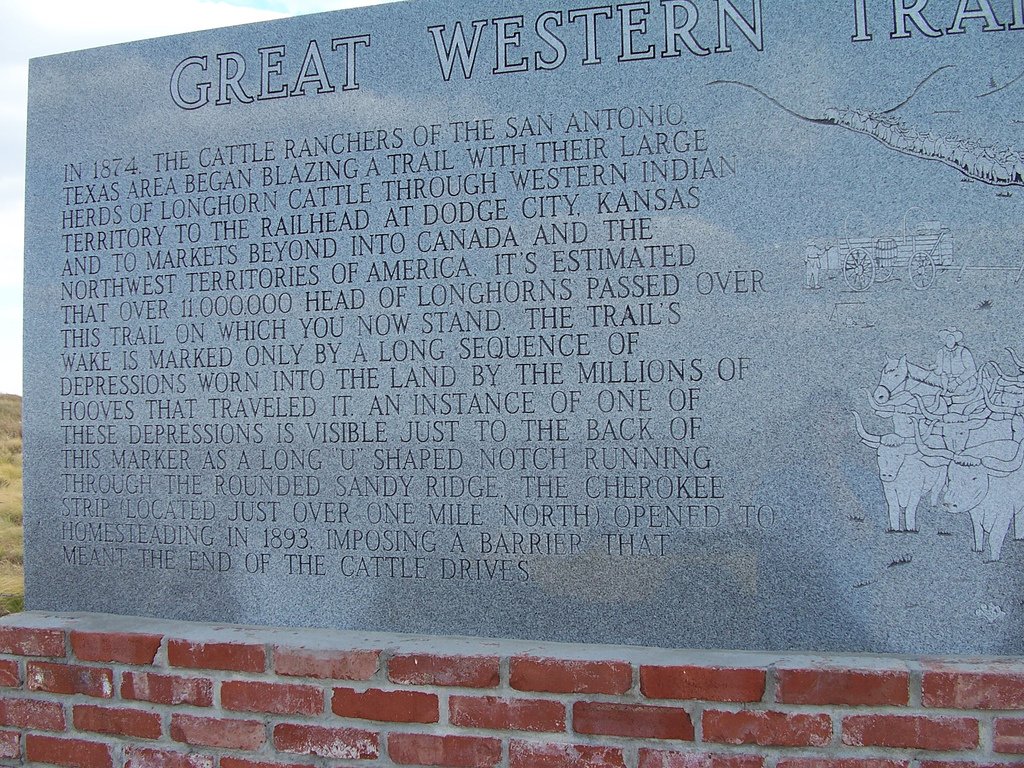 In 1874, the cattle ranchers of the San Antonio, Texas area began blazing a trail with their large herds of longhorn cattle through western Indian Territory to the railhead at Dodge City, Kansas and to markets beyond into Canada and the northwest territories of America. It's estimated that over 11,000,000 head of longhorns passed over this trail on which you now stand, the trail's wake is marked only by a long sequence of depressions worn into the land by the millions of hooves that traveled it, and instance of one of these depressions is visible just to the back of this marker as a long "U" shaped notch running through the rounded sandy ridge the Cherokee Strip (located just over one mile north) opened to homesteading in 1893, imposing a barrier that meant the end of cattle drives