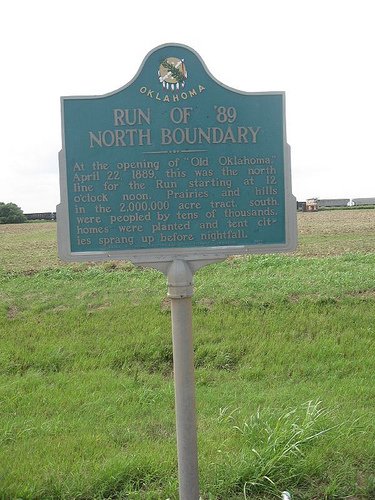 Run Of '89 North Boundary. At the opening of "Old Oklahoma," April 22, 1889, this was the north line for the Run starting at 12 o'clock noon. Prairies and hills in the 2,000,000 acre tract, south, were peopled by tens of thousands, homes were planted and tent cities sprang up before nightfall.