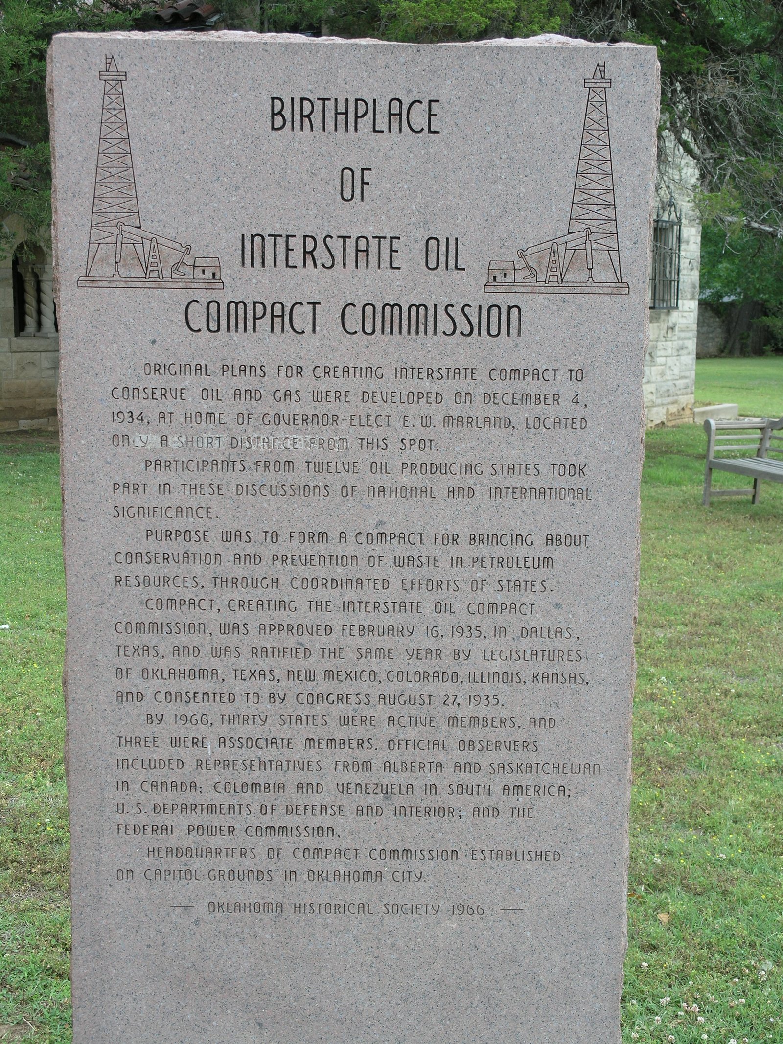 Original plans for creating interstate compact to conserve oil and gas were developed on December 4, 1934, at home of Governor-Elect E.W. Marland, located only a short distance from this spot. Participants from twelve oil producing states took part in these discussions of national and international significance. Purpose was to form a compact for bringing about conservation and prevention of waste in petroleum resources, through coordinated efforts of states. Compact, crating the interstate oil compact commission, was approved February 16, 1935, in Dallas, Texas, and was ratified the same year by legislatures of Oklahoma, Texas, New Mexico, Colorado, Illinois, Kansas, and consented to by Congress August, 27, 1935. By 1966, thirty states were active members, and three were associate members. Official observers included representatives from Alberta and Saskatchewan in Canada; Columbia and Venezuela in South America; U. S. Departments of Defense and interior; and the Federal Power Commission. Headwaters of Compact Commission established on Capitol grounds in Oklahoma City. - Oklahoma Historical Society 1966.