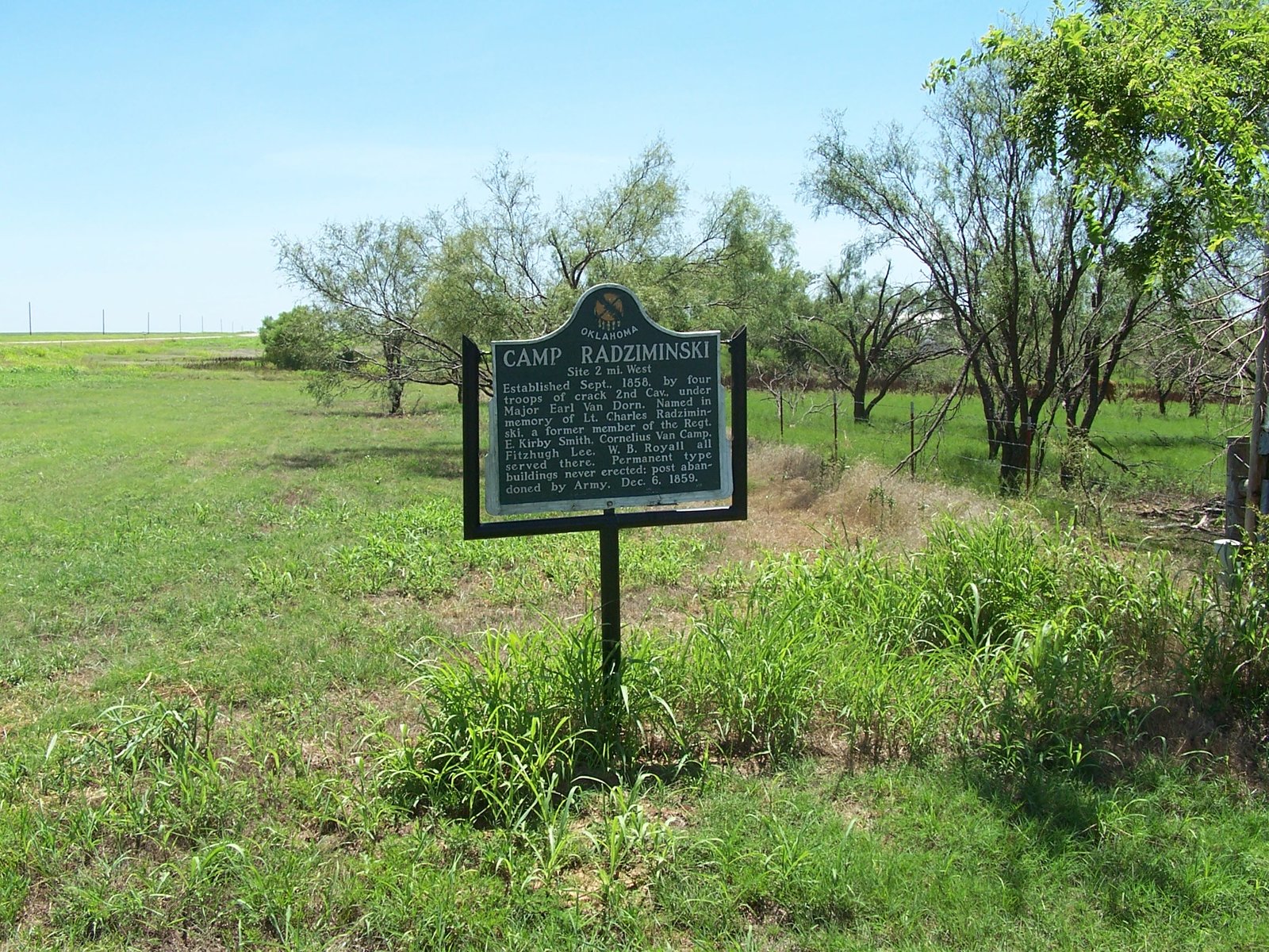 From his base of operations at Camp Radziminski Van Dorn led his troops against the Comanches at the Battle of the Wichita Village near present Rush Springs, Oklahoma, in October 1858, and at Crooked Creek in southwestern Kansas in May 1859. Abandoned after the completion of Fort Cobb in December 1859, Camp Radziminski was briefly used by the Texas Rangers in their warfare against the Comanches. The site of Camp Radziminski near Mountain Park was placed on the National Register of Historic Places in 1972 (NR 72001067). - FortTours.com: Camp Radziminski