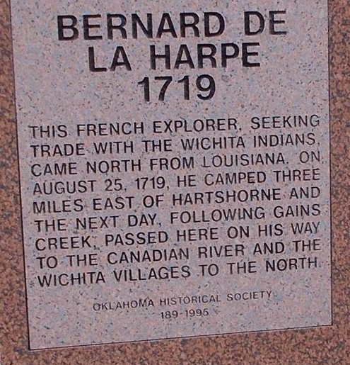 This French Explorer, seeking trade with the Wichita Indians, came north from Louisiana, on August 25, 1719, he camped three miles east of Hartshorne and the next day, following Gains Creek, passed here on his way to the Canadian River and the Wichita Villages to the north.