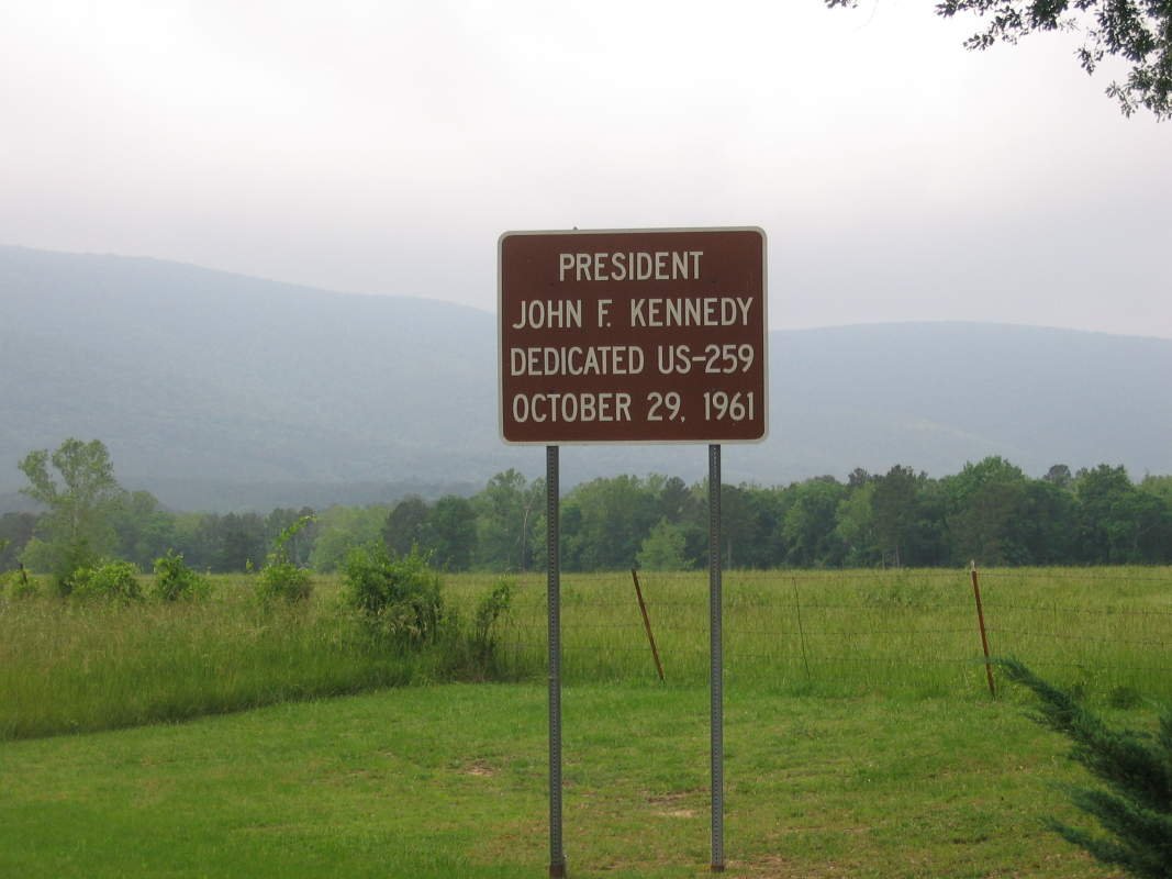 This monument, commemorating the visit of President John F. Kennedy to Big Cedar, was erected under the auspices of the Knights of Columbus, who deeded shaft and land to the Oklahoma Historical Society on October 30, 1966.