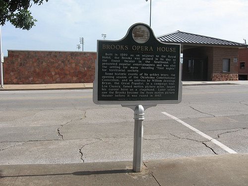 Some historic events of its golden years, the opening session of the Oklahoma Constitutional Convention, and an address by William Jennings Bryan, the Great Populist, in a campaign tour. Lon Chaney, famed motion picture actor, began his career here as a stagehand. Later years saw the Brooks become the Avon motion picture theater before it was razed in 1967.