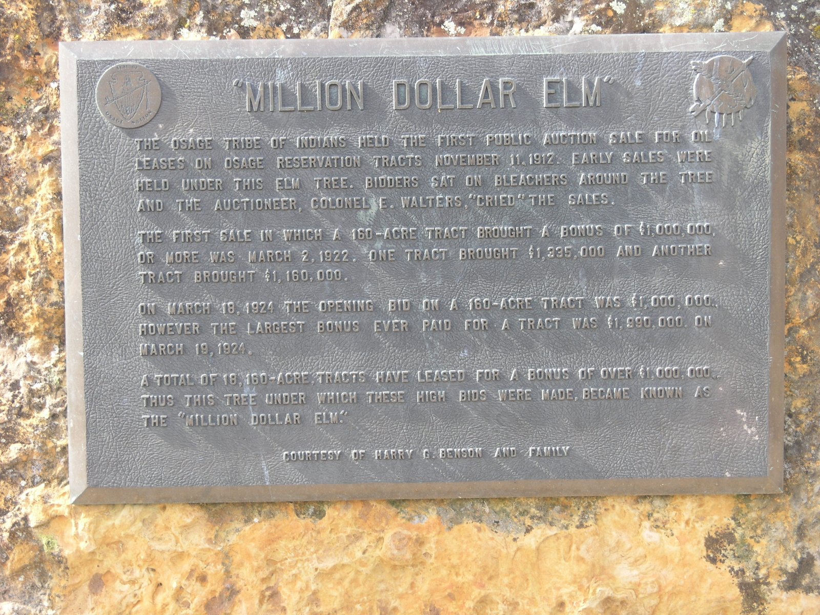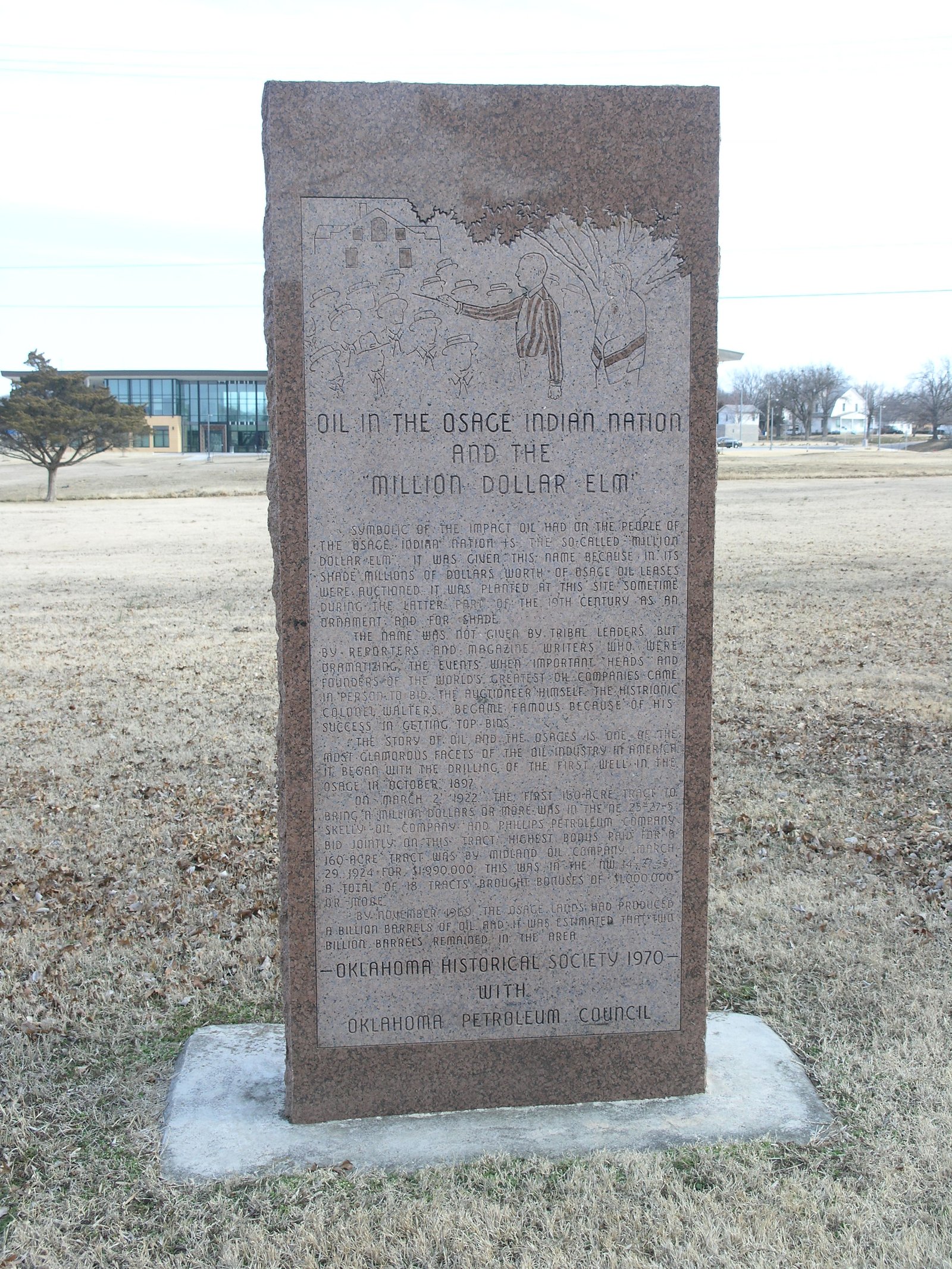 The discovery of "black gold" in Oklahoma precipitated one of the greatest rushes in the history of the West. One of the most famous oil discoveries took place on the Osage Reservation in the northeastern portion of Oklahoma. The mineral rights to the lands were sold to the highest bidder at auctions held under a large elm tree in Pawhuska. Because of the tremendous wealth that traded hands beneath its limbs, the tree became known as the "Million Dollar Elm".