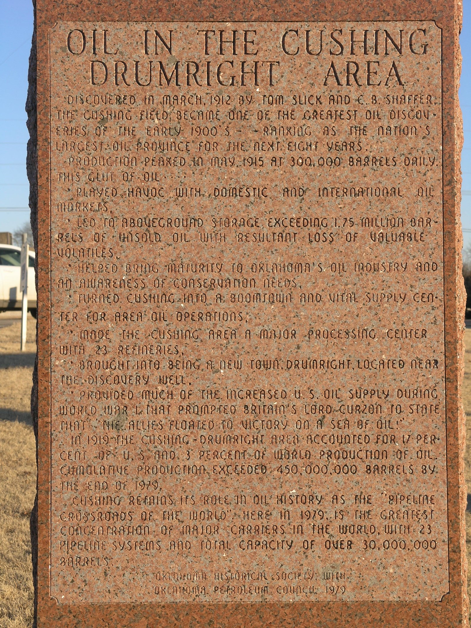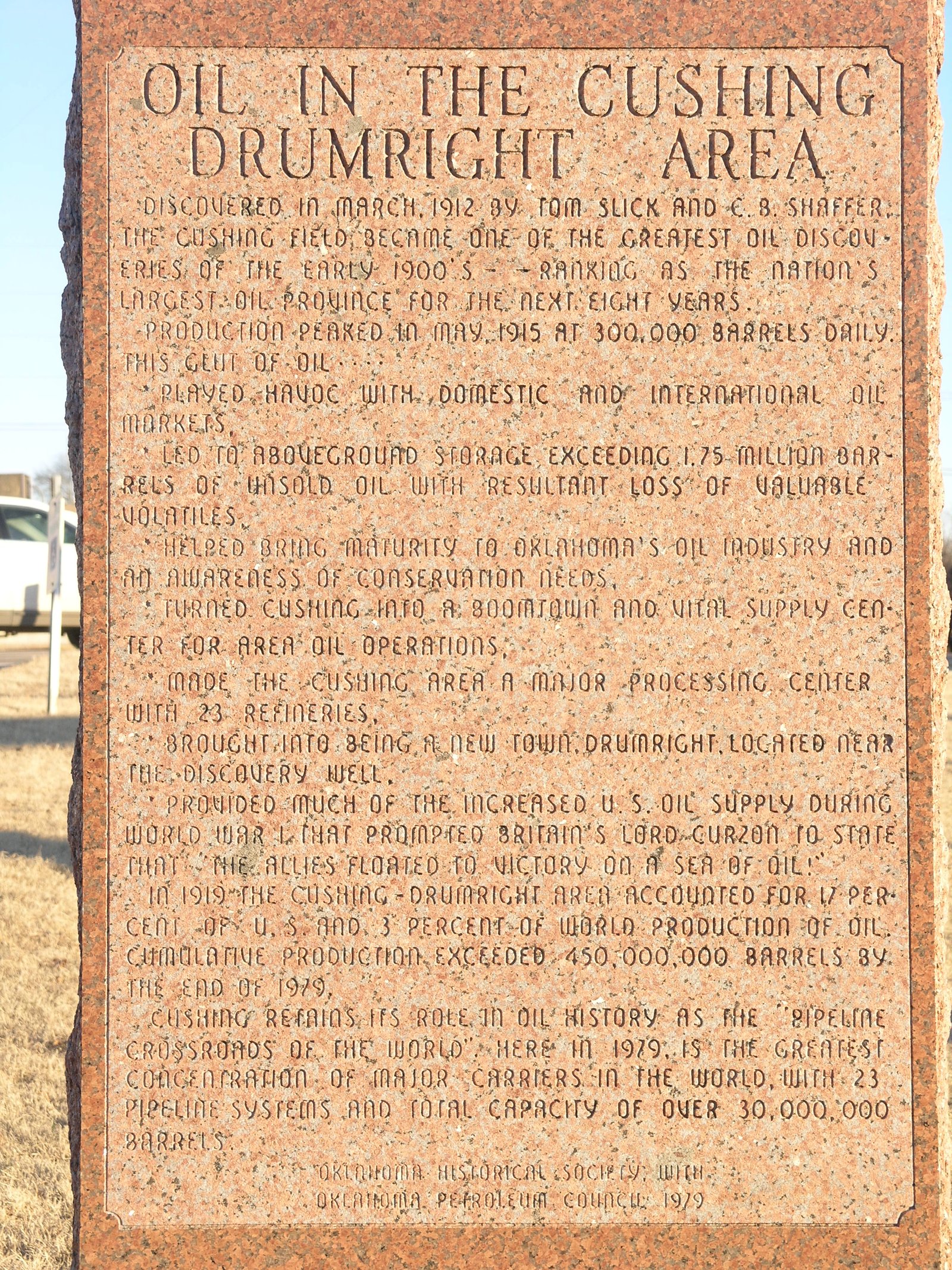 Discovered in March 1912 by Tom Slick and C. B. Shaffer, the Cushing field became one of the greatest oil discoveries of the early 1900's -- Ranking as the nation's largest oil province for the next eight years. Production peaked in May 1915 at 300,000 barrels daily. This glut of oil played havoc with domestic and international oil workers. Led to above ground storage exceeding 1.75 million barrels of unsold oil with resultant loss of valuable volatiles. Helped bring maturity to Oklahoma's oil industry and an awareness of conservation needs. Turned Cushing into a boomtown and vital supply center for area oil operations. Made the Cushing area a major processing center with 23 refineries. Brought into being a new town, Drumright, located near the discovery well. Provided much of the increased U.S. oil supply during World War 1 that prompted Britain's Lord Curzon to state that the allies floated to victory on a sea of oil. Cumulative production exceeded 450,000,000 barrels by the end of 1979. Cushing retains its role in oil history as the "pipeline crossroads of the world" Here in 1979 is the greatest concentration of major carriers in the world, with 23 pipeline systems and total capacity of over 30,000,000 barrels. - Oklahoma Historical Society with Oklahoma Petroleum Council, 1979