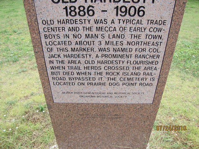 Old Hardesty was a typical trade center and the mecca of early cowboys in "No Man's Land", the town located about 3 miles northeast of this marker was named for Col. Jack Hardesty, a prominent rancher in the area. Old Hardesty flourished when trail herds crossed, the area but died when the Rock Island Rail Road bypassed it. The cemetery is located on Prairie Dog Point Road.