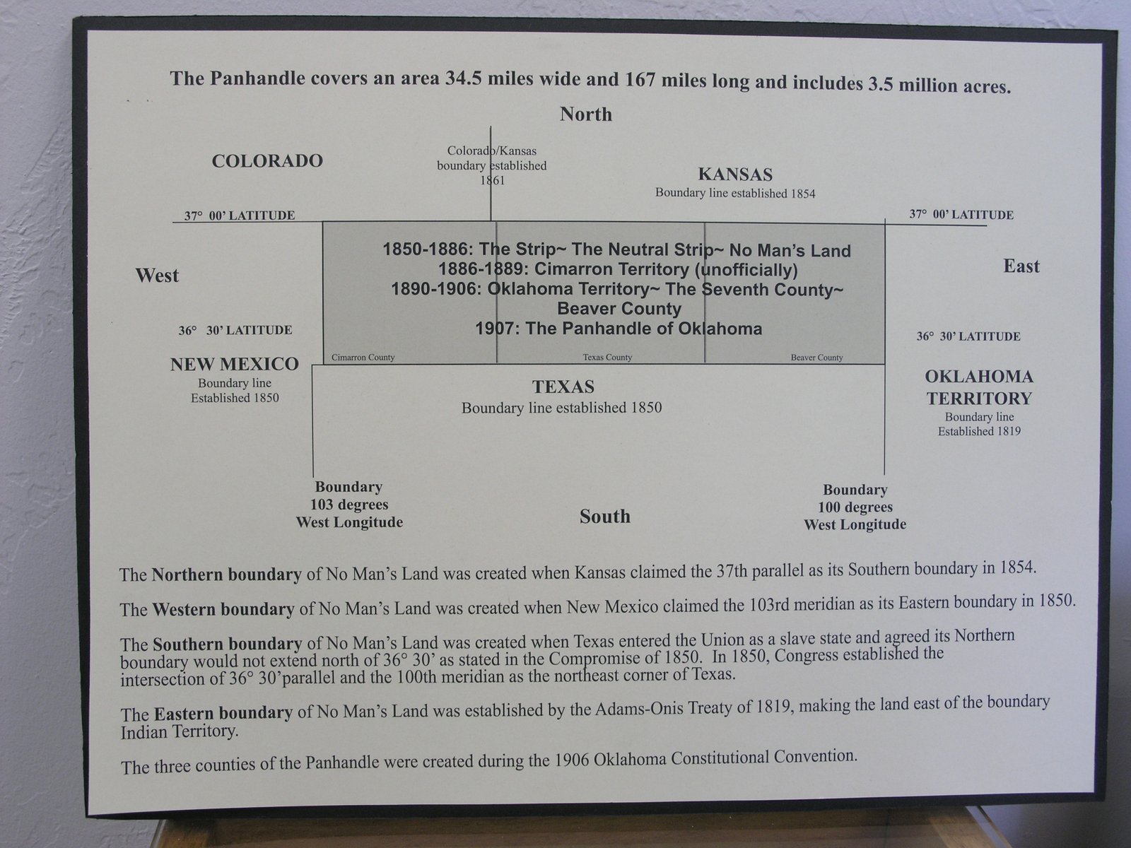When the Territory of Kansas was created in 1854 its boundary was set at the 37th parallel. When Texas came into the union, being a slave state, it could not extend its sovereignty over any territory north of 36° 30' North. The Missouri Compromise specified that territory North of this line would be free-state territory. This situation left a narrow strip of land 34 miles wide between Kansas and Texas extending from the 100th parallel on the East to the 103rd parallel on the West, a total of 168 miles in length. At the eastern end of the area was the Cherokee Outlet and at the western end was the Territory of New Mexico. Since the area was claimed by no state, it was soon given the name of No Man's Land.