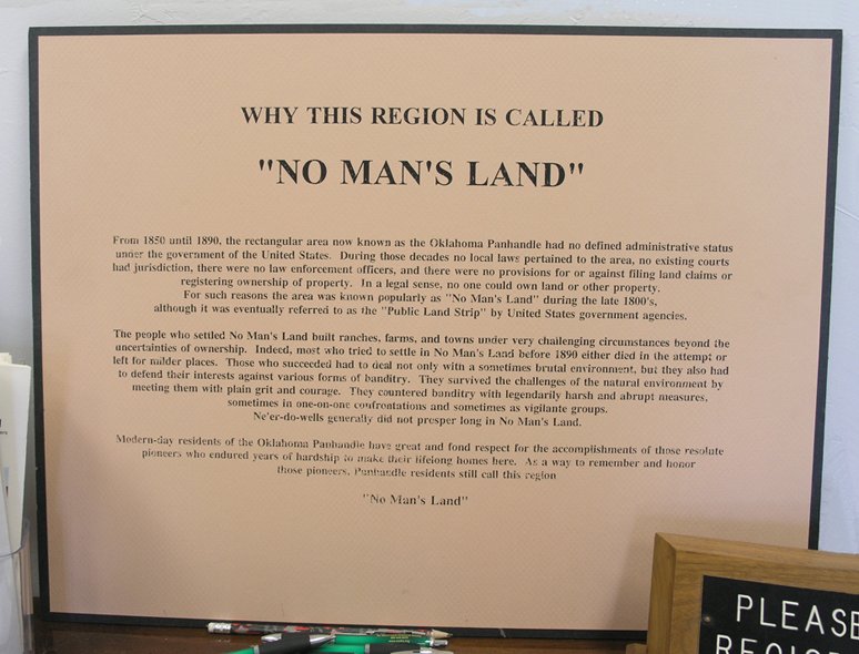 In the mid 1880s drought and depression caused many to leave heavily mortgaged farmlands in western Kansas. They became squatters in what was in time to become the Oklahoma Panhandle. Townsites were organized and trade centers and villages began to spring up. While the settlers could not receive legal title to the land they settled, precedents in other territorial regions indicated the Federal Government would in time recognize "Squatter's Rights." Under the leadership of Dr. Owen G. Chase, the settlers of No Man's Land began to think of the possibility of establishing a territory. Congress felt the planned Cimarron Territory was not large enough to justify the creation of a territory, and in 1890 No Man's Land was attached to Oklahoma Territory becoming known as Beaver County. No Man's Land Museum chronicles the struggles of the settlers as they established their own government and developed their communities. The museum is operated by the No Man's Land Historical Society.