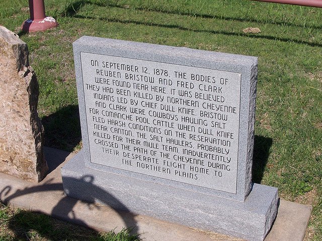 On September 12, 1878, the bodies of Reuben Bristow and Fred Clark were found near hear. It was believed they had been killed by Northern Cheyenne Indians lead by Chief Dull Knife. Bristow and Clark where cowboys hauling salt for Comanche Pool cattle when Dull Knife fled harsh conditions on the reservation near canton. The salt haulers, probably crossed the path of the Cheyenne during their desperate flights home to the northern plains.
